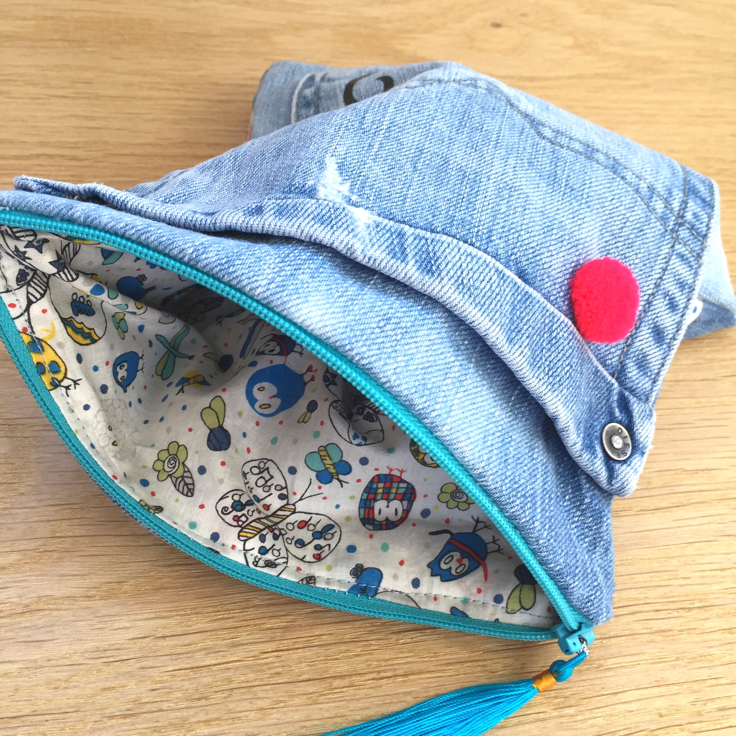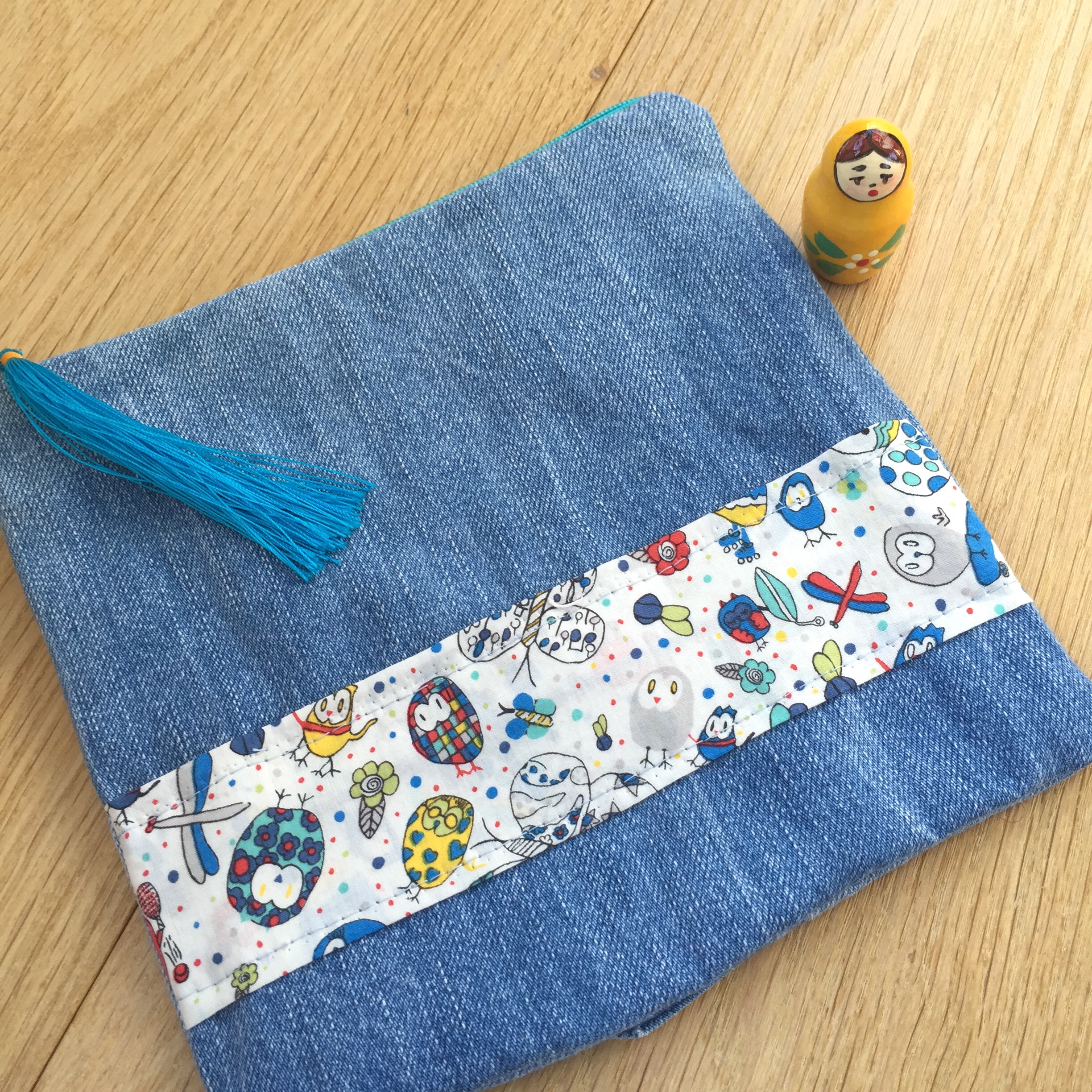 Pretty jeans “pochette” with black mustache and fluo pink pompom – unique piece. Inside Liberty fabric with owls pattern.