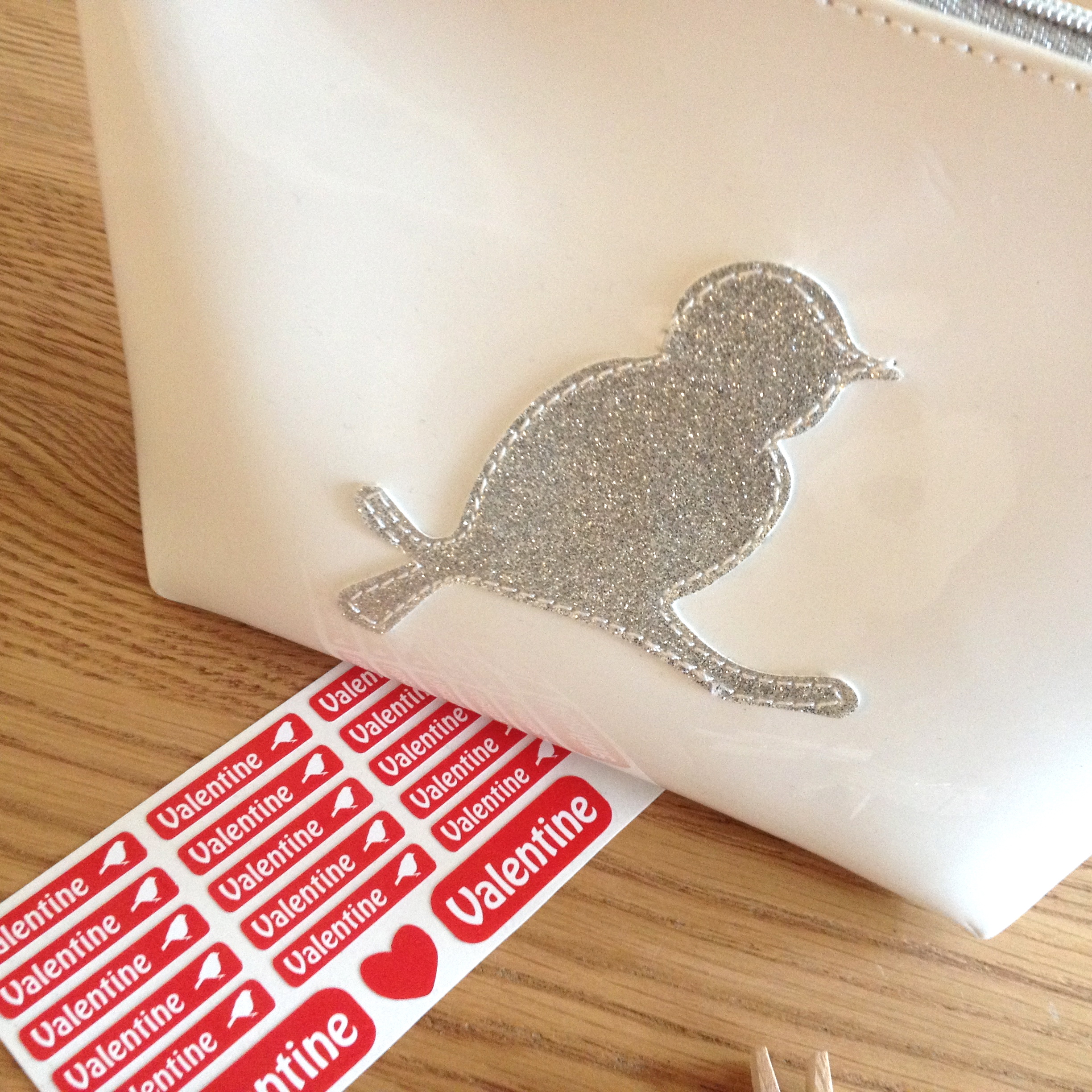 Chic and trendy vinyl vanity case by the french creator ANNE-CHARLOTTE GOUTAL white with silver birds. It is delivered with 15 personalised stickers, to label your lipstick, eye shadow or blusher, plus 2 big labels to stick on your vanity case.
