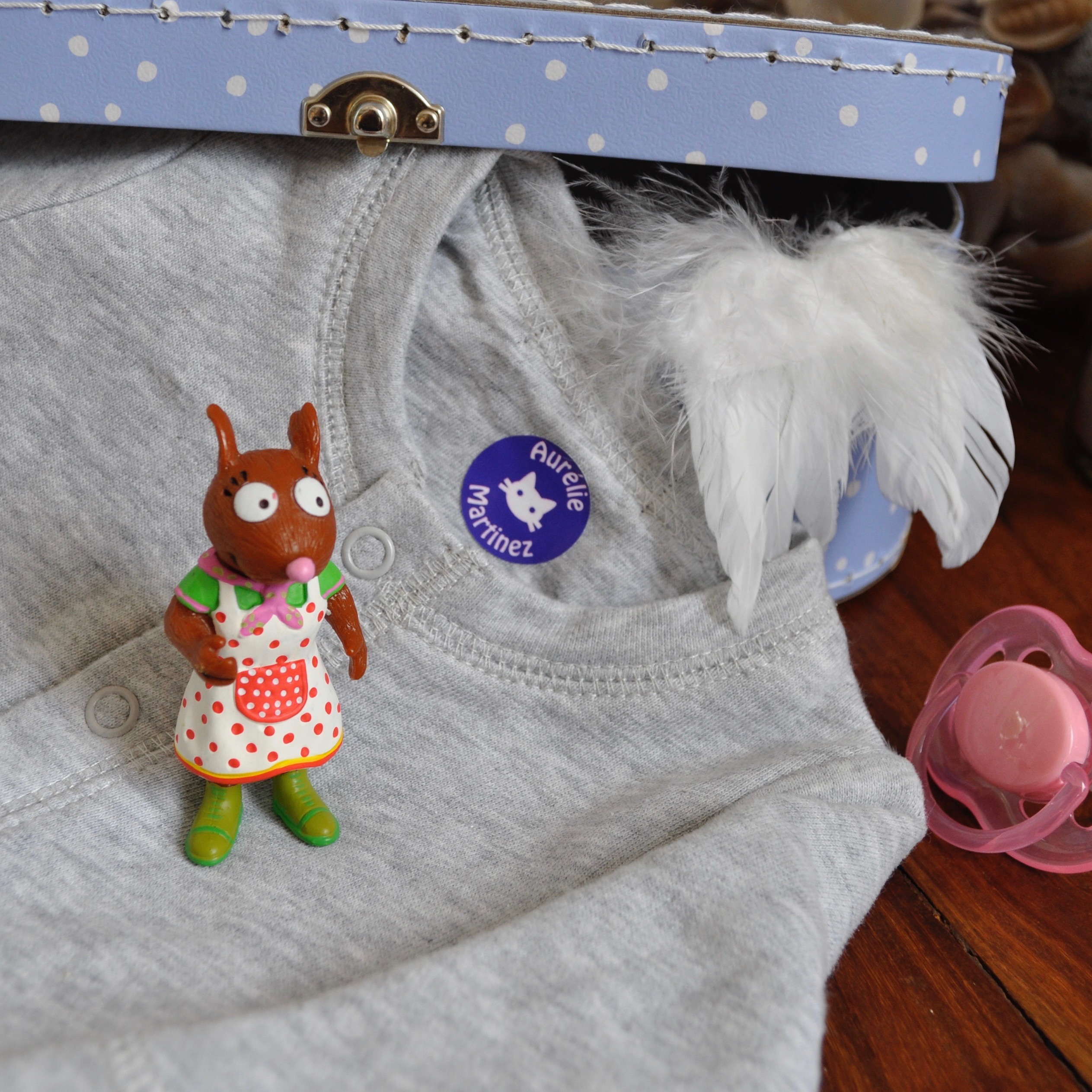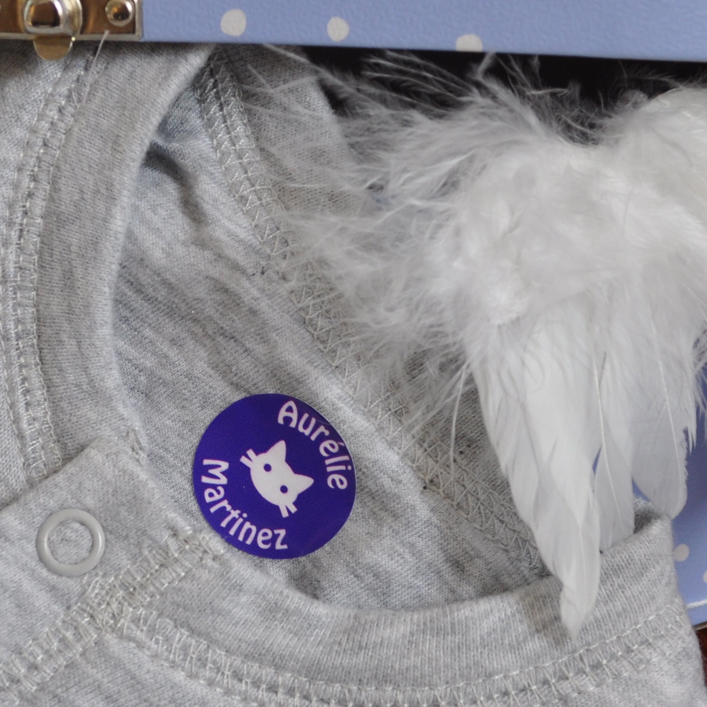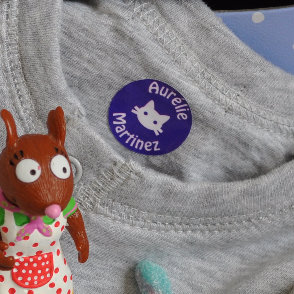30 personalised identical iron-on labels Maximum 26 characters Illustration centered or no illustration Diameter size: 2.5 cm