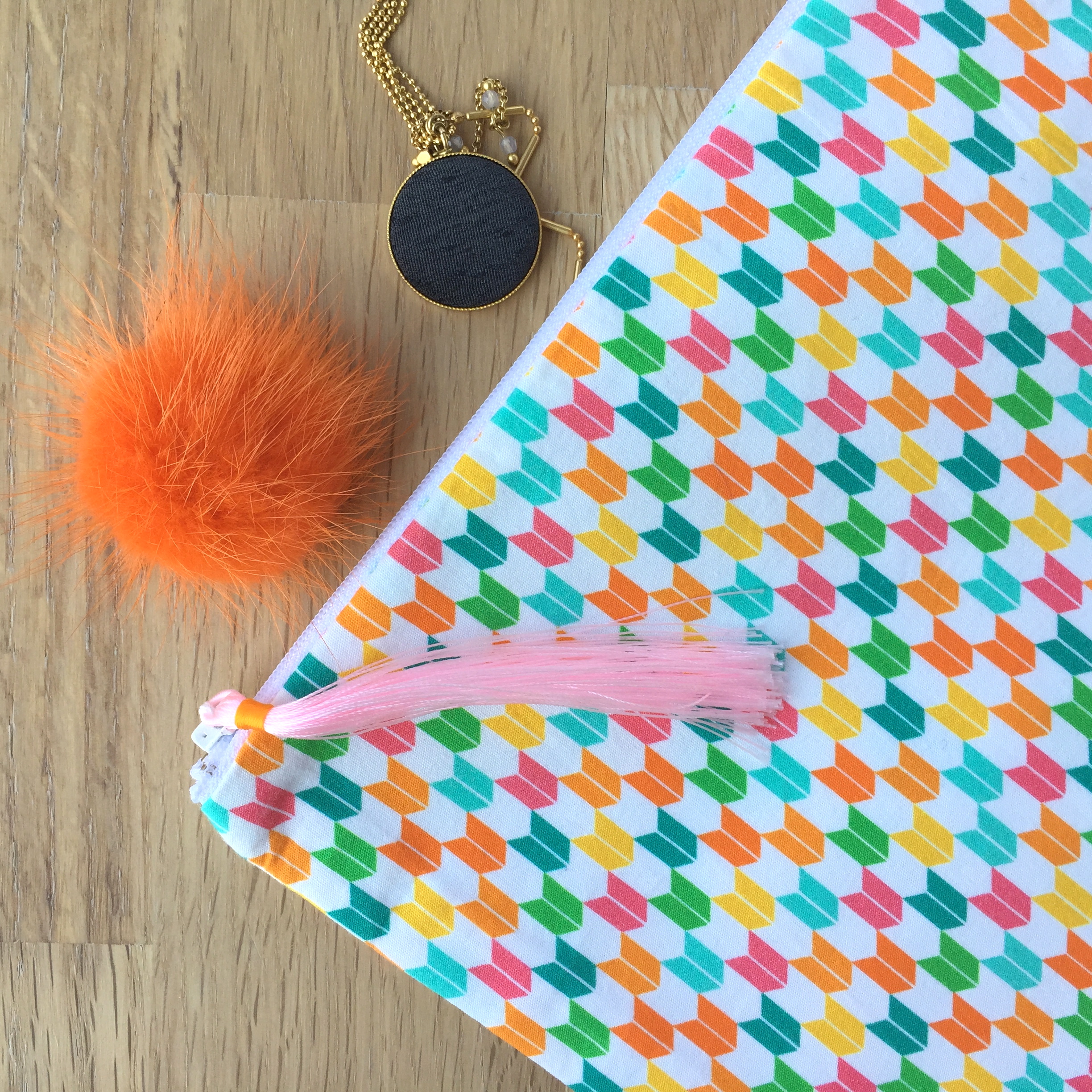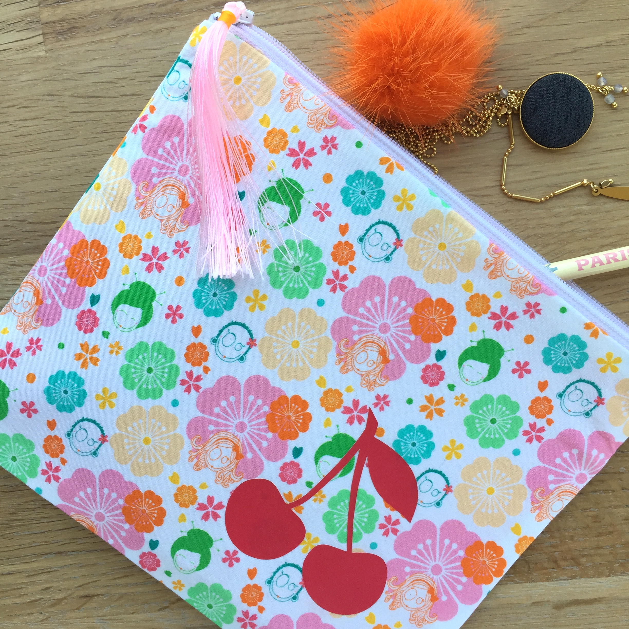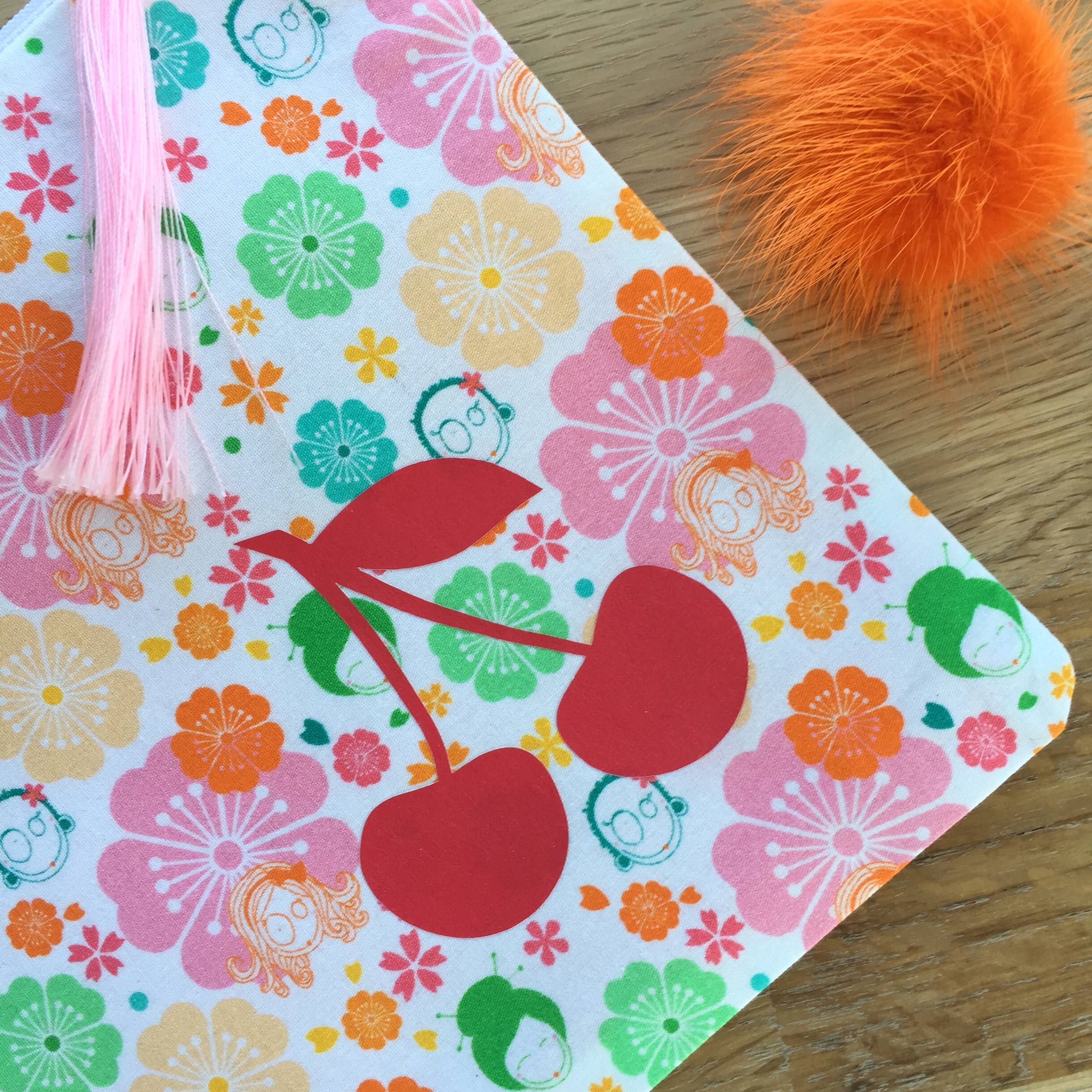 Pochette en tissus Madame  MO avec cerises roses foncé et arrière tissus graphique Stick2it – pièce unique. Intérieur en tissus rose et Madame MO.