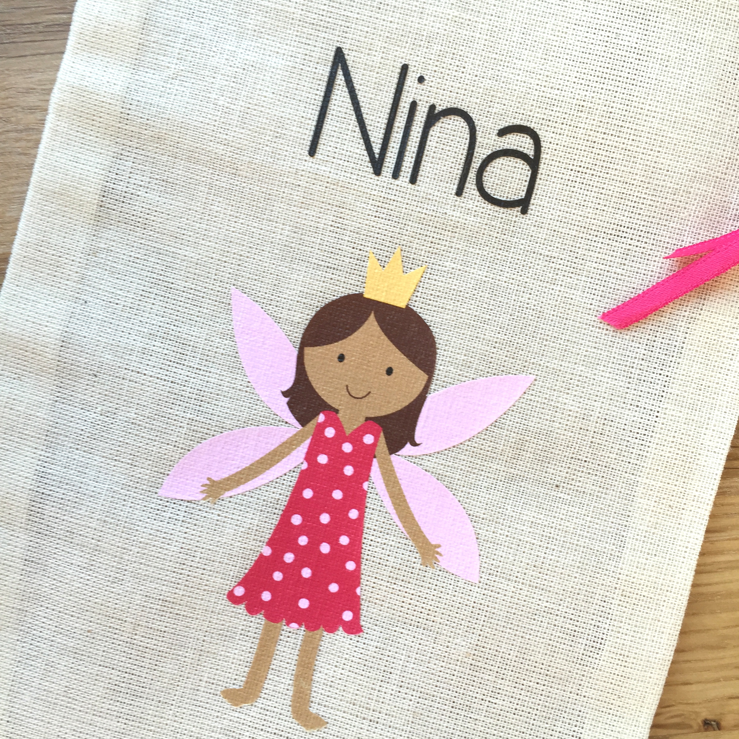 Petit sachet en mousseline de coton personnalisé décoré d’une Petite Fée pour y glisser un tout petit cadeau ou ses secrets de fée.