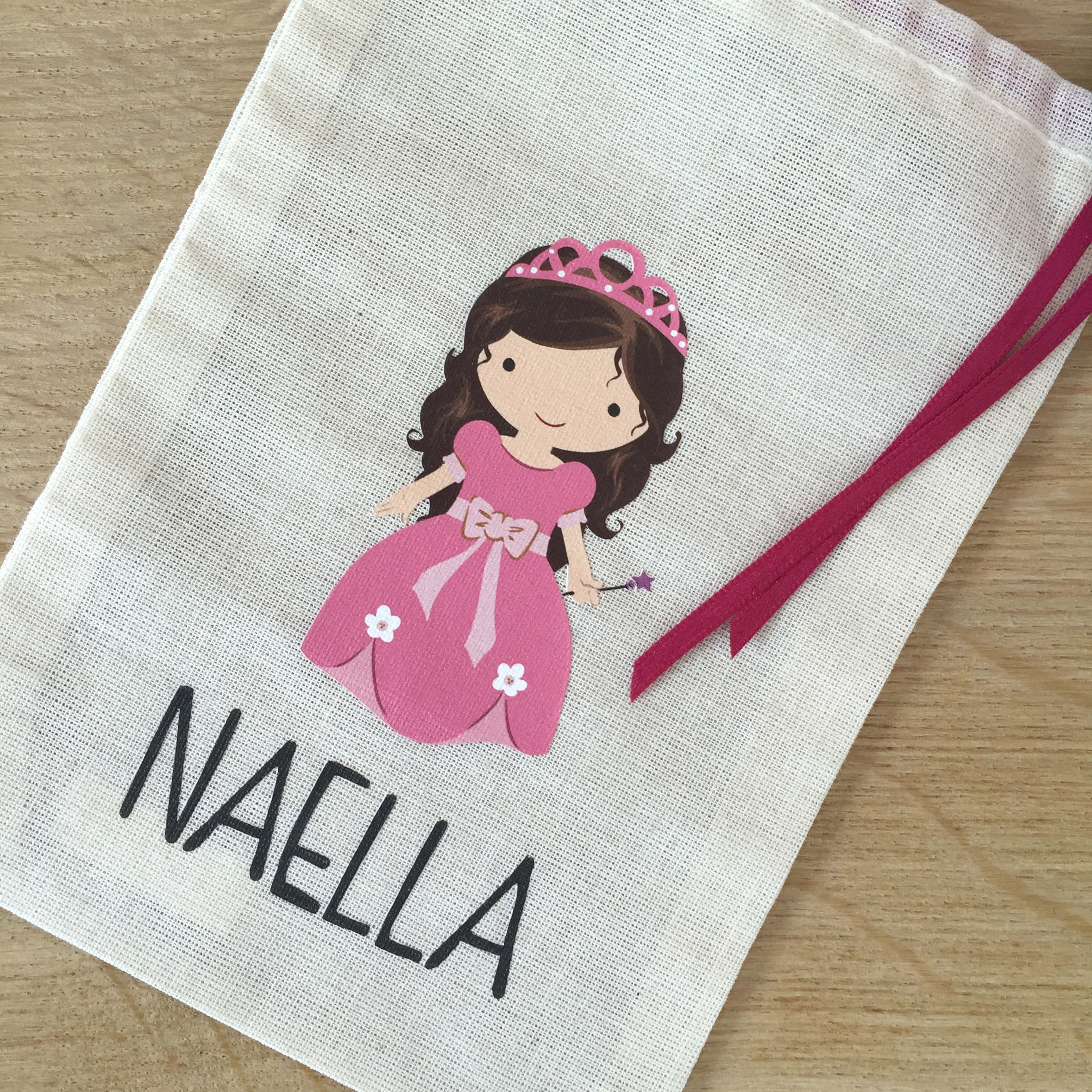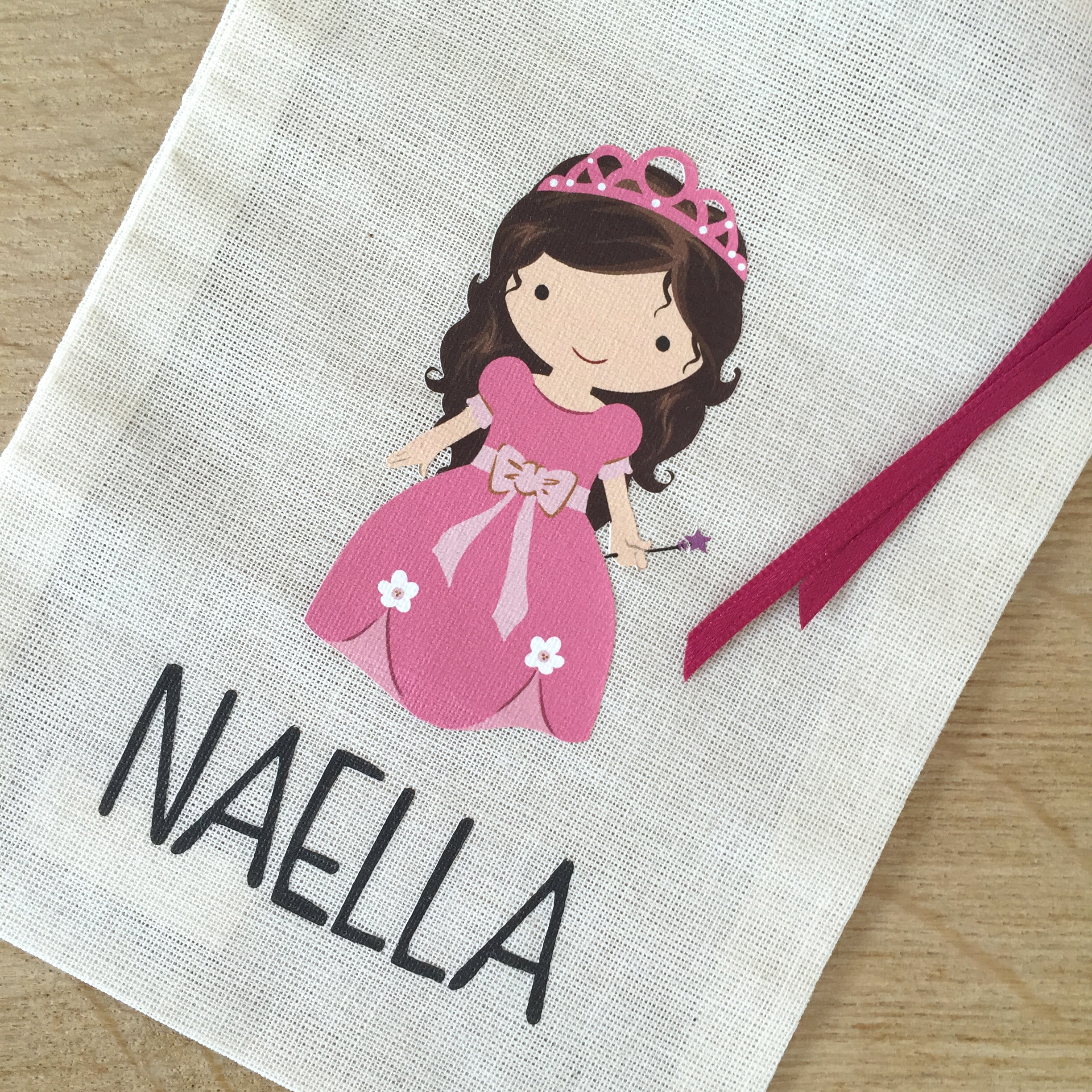 Petit sachet en mousseline de coton personnalisé décoré d’une Princesse pour y glisser un tout petit cadeau ou ses secrets de princesse.