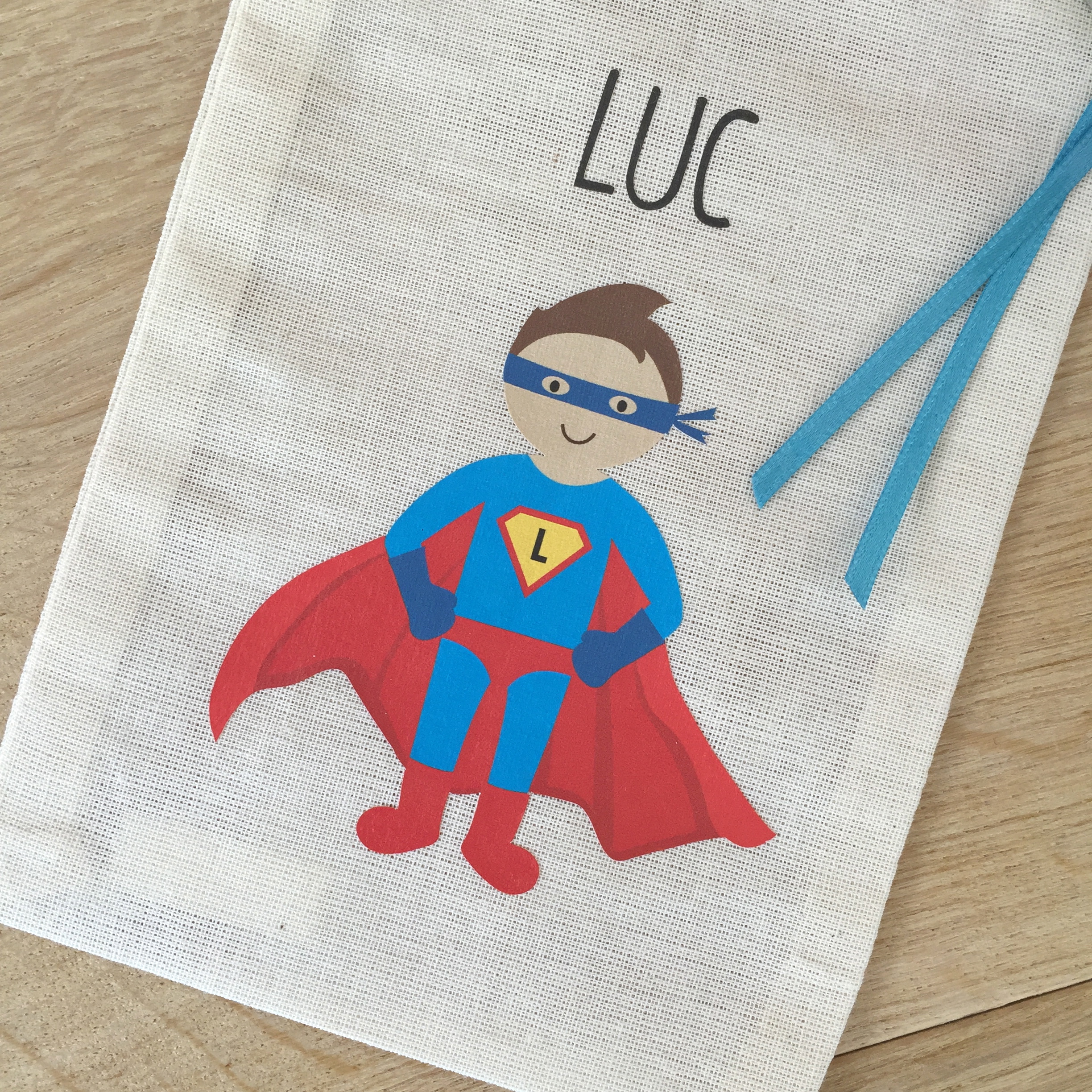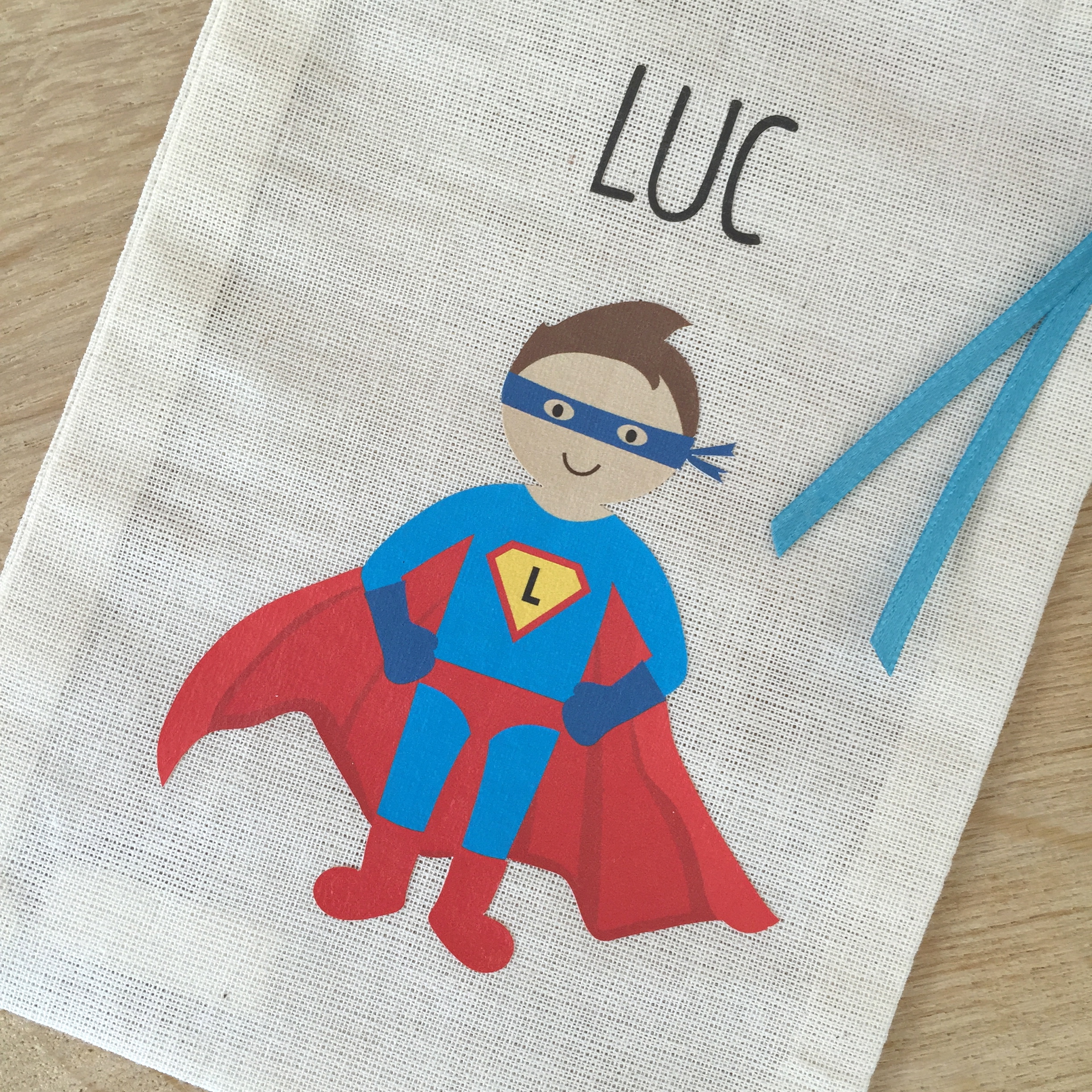 Petit sachet en mousseline de coton personnalisé décoré d’un Super Héros pour y glisser une jolie surprise.