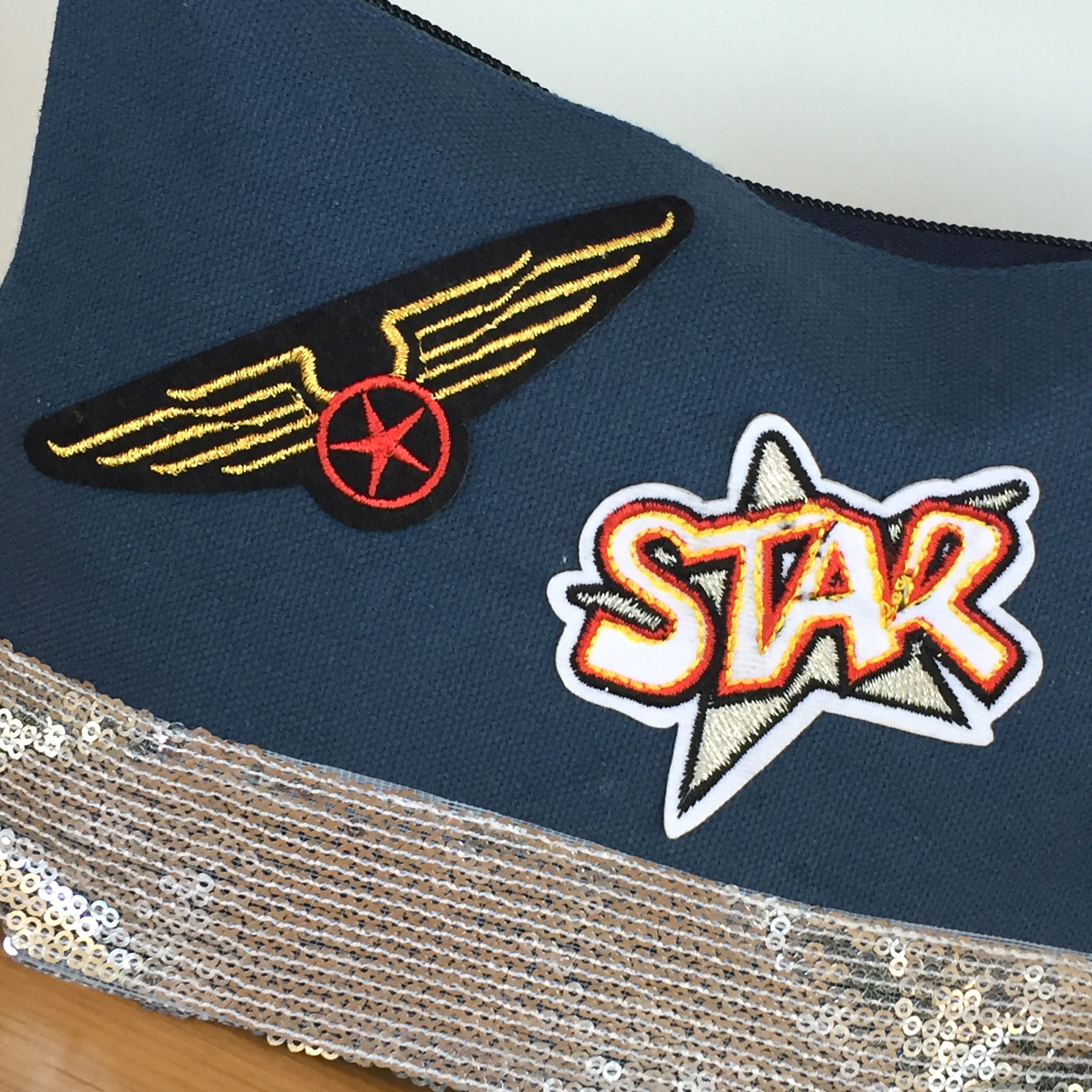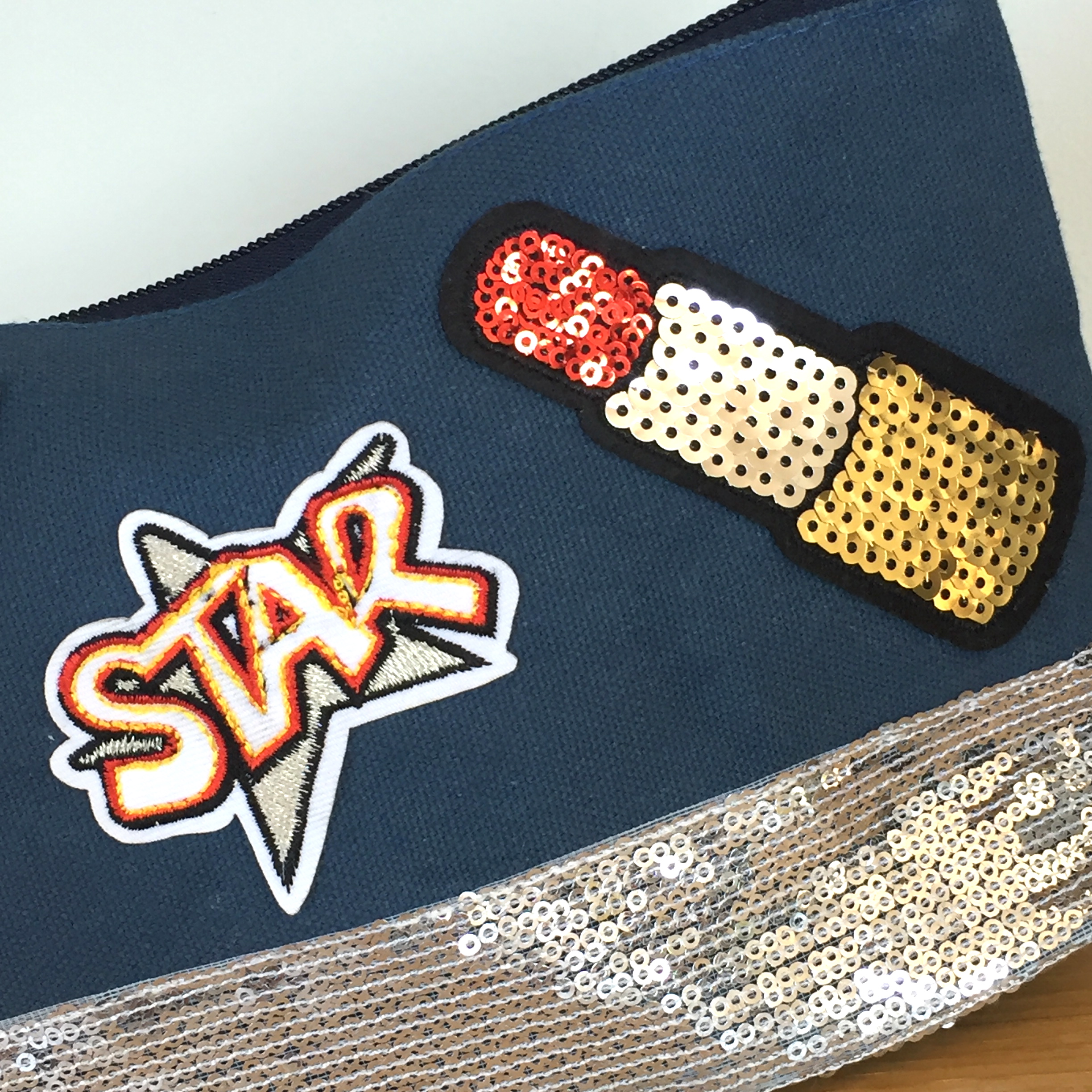 Trousse bleue avec sequins argentés et patchs – pièce unique Stick2it.