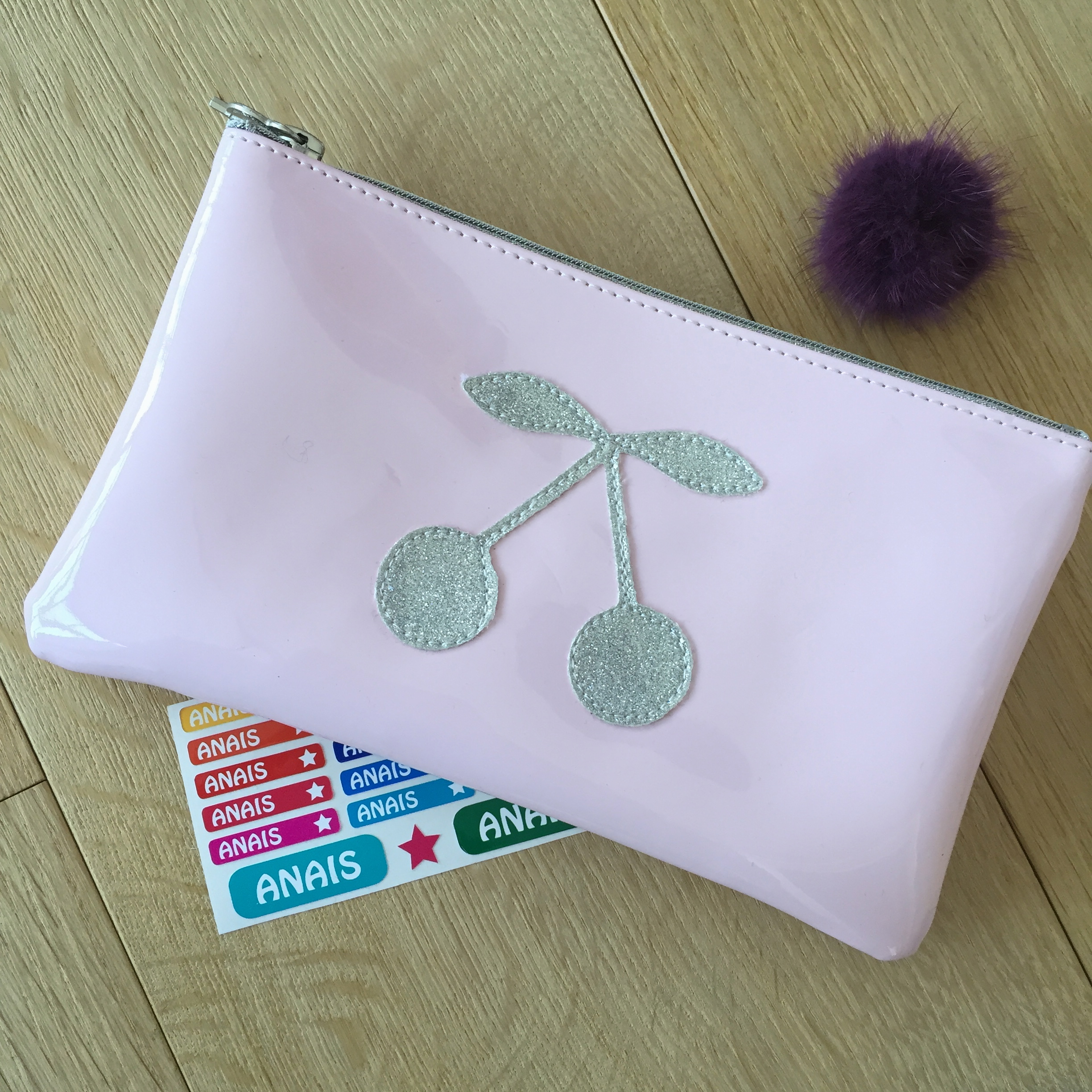 Jolie trousse de la marque ANNE-CHARLOTTE GOUTAL en vinyle rose pâle avec cerises argentées, livrée avec 15 petites et 2 grandes étiquettes autocollantes personnalisables pour marquer crayons, forme et taille-crayons à son nom.
