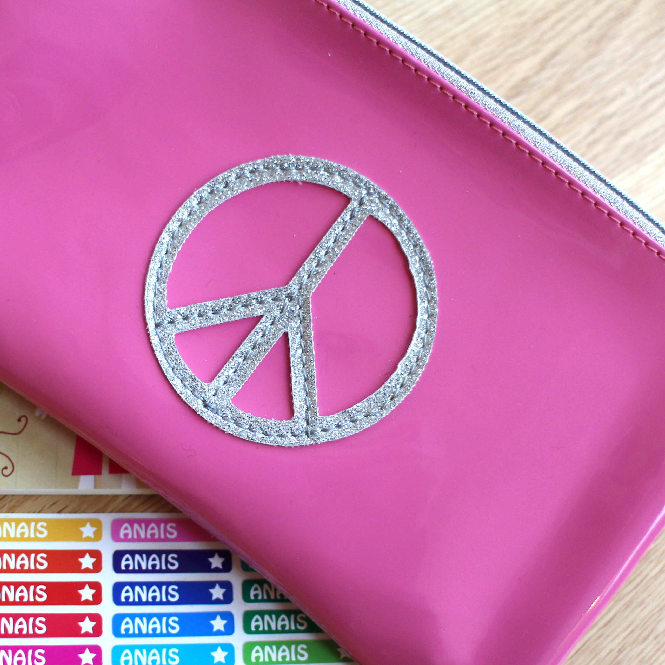 Superbe trousse de la marque ANNE-CHARLOTTE GOUTAL en vinyle rose avec motifs Peace & Love argentés, livrée avec 15 petites et 2 grandes étiquettes autocollantes personnalisables pour marquer crayons, gomme, et taille-crayons à son nom