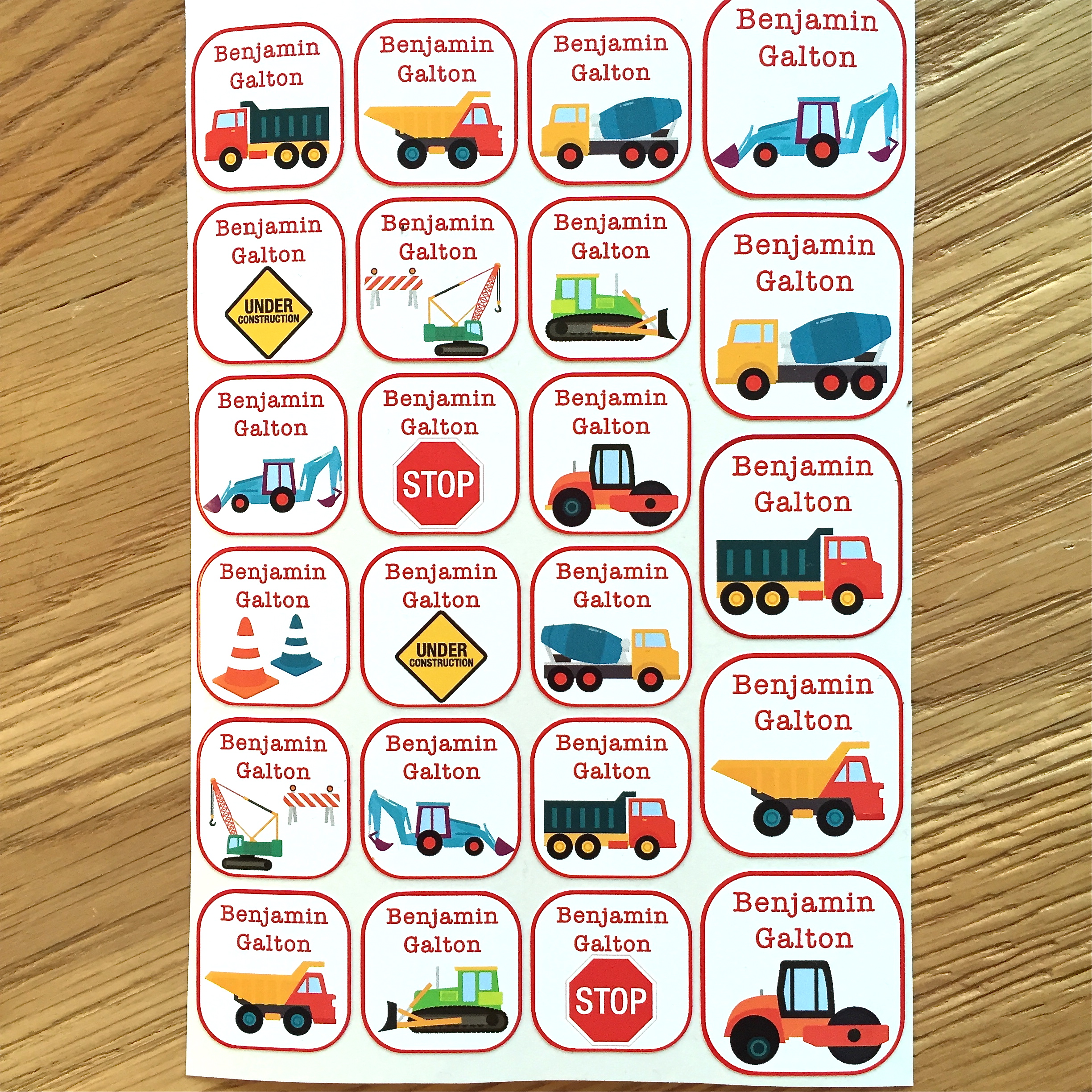 Camions, pelleteuses et tous les panneaux nécessaires sur un chantier pour ces autocollants personnalisables.