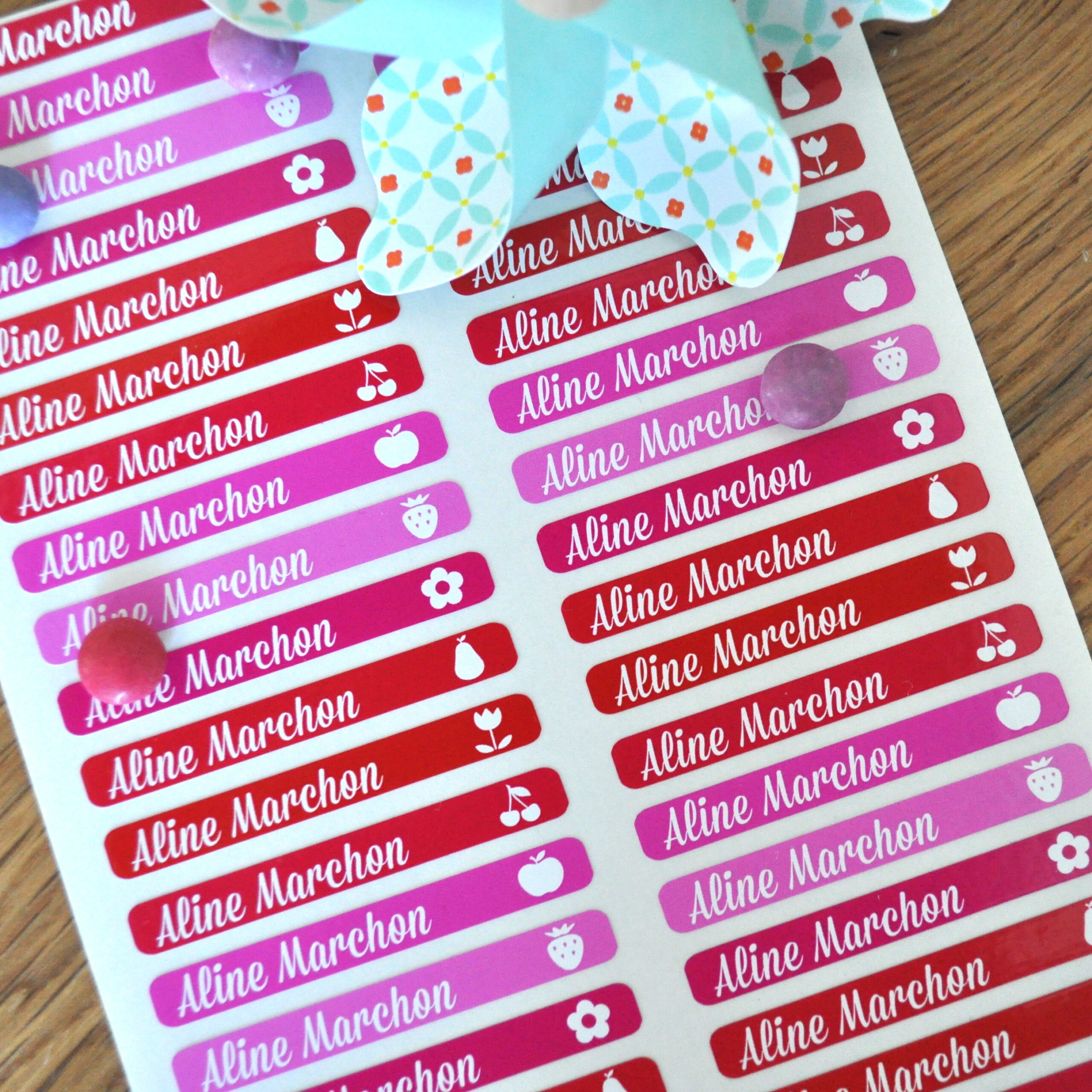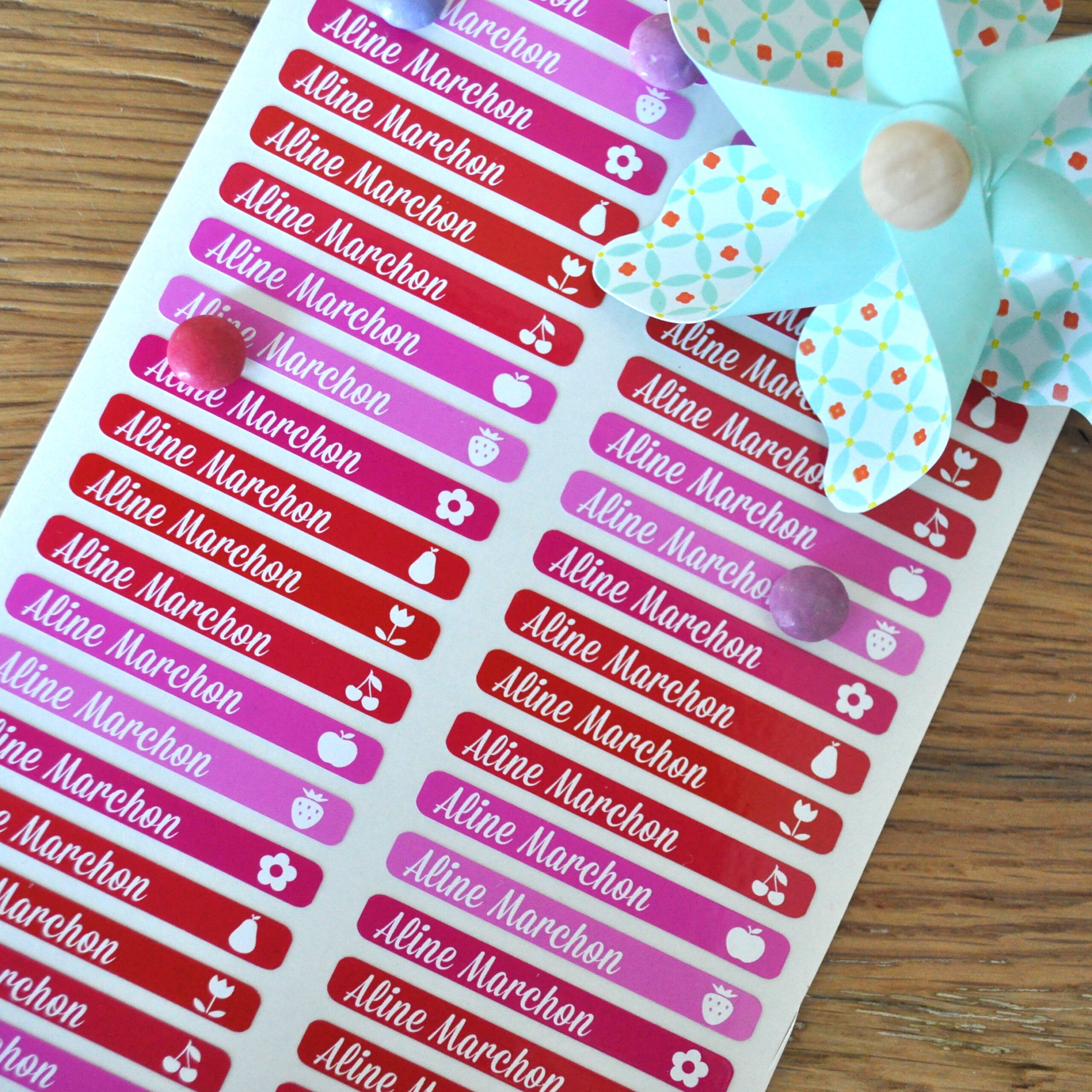 Des étiquettes autocollantes roses pour personnaliser les crayons, stylos et petites affaires.