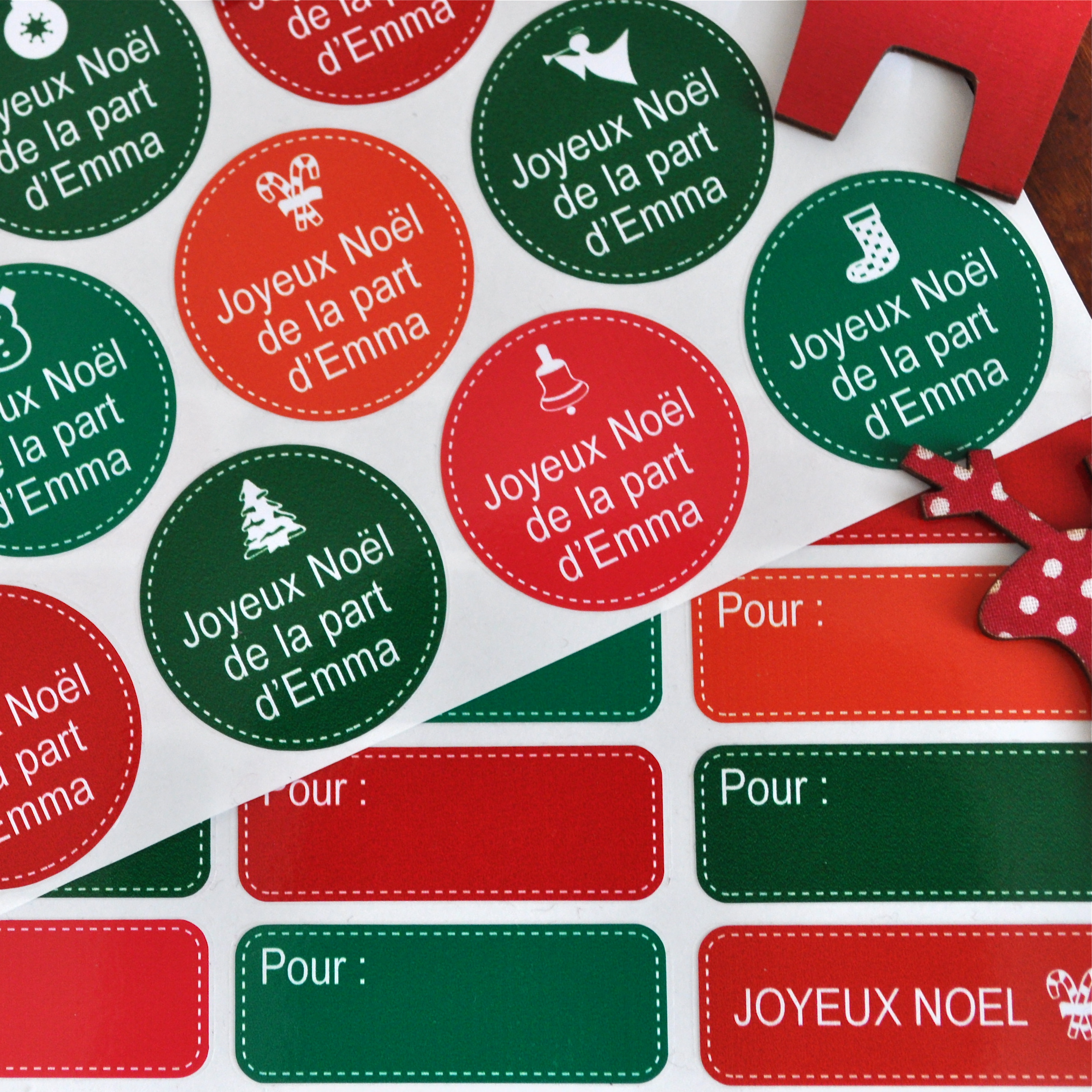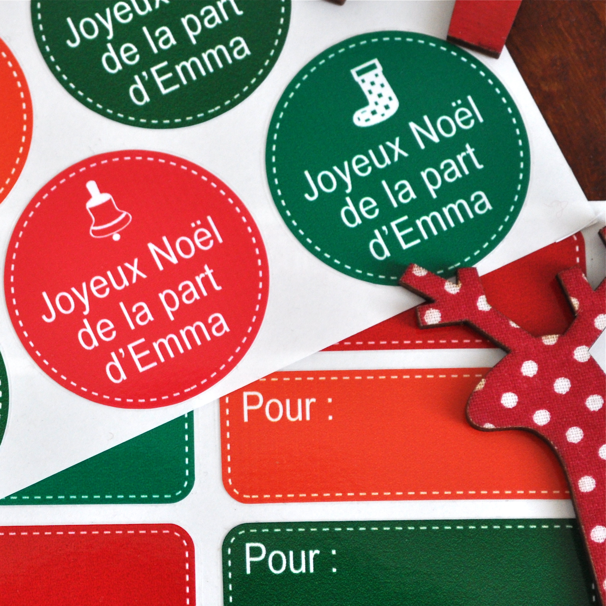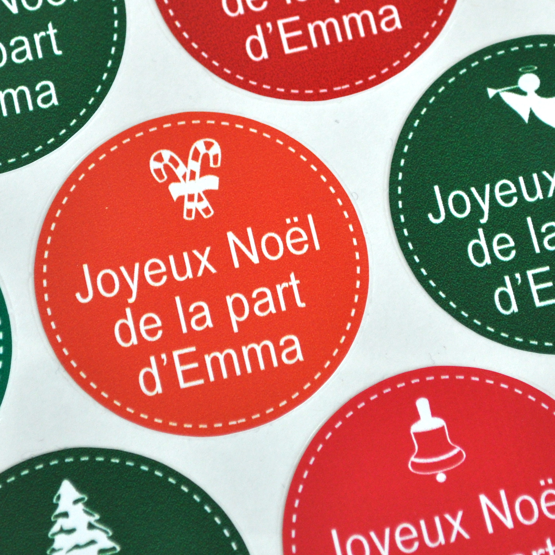 11 étiquettes rondes avec le texte « Joyeux Noël de la part de/d’/des… » – à compléter ensuite avec le(s) nom(s) souhaité(s).